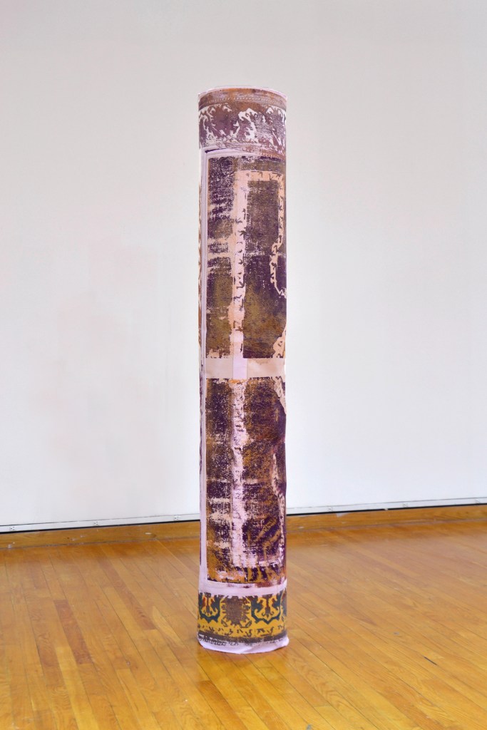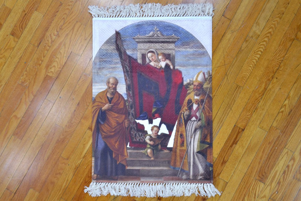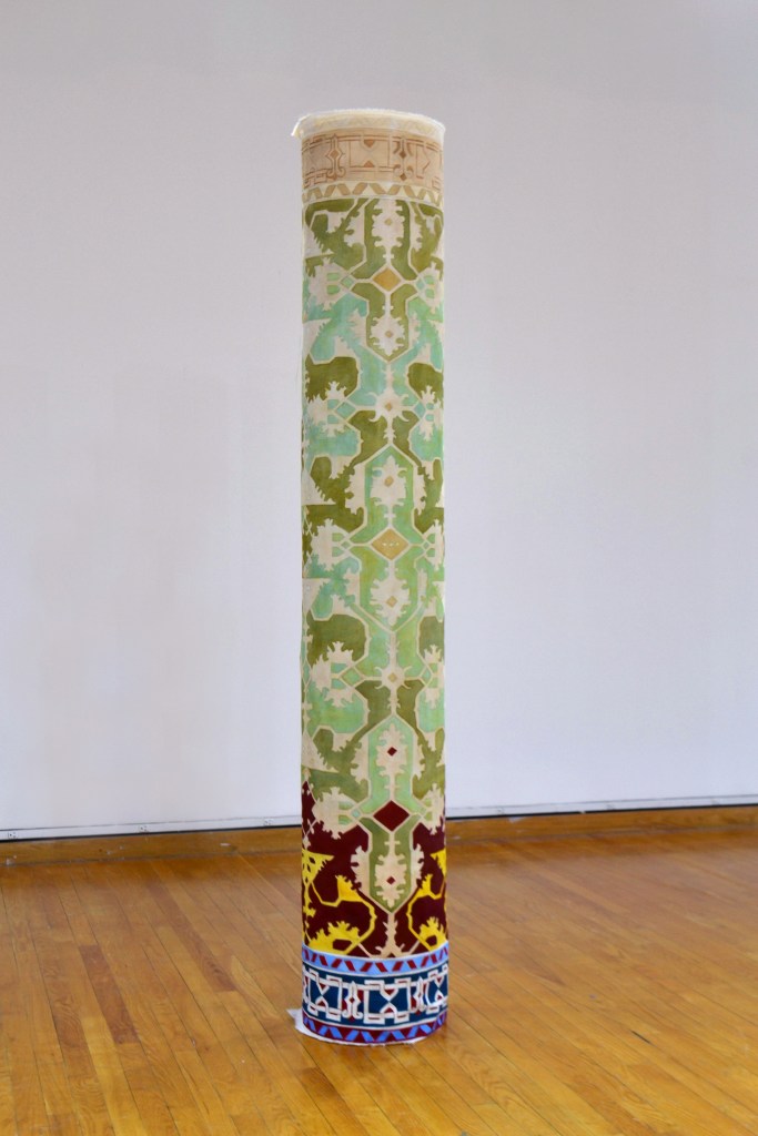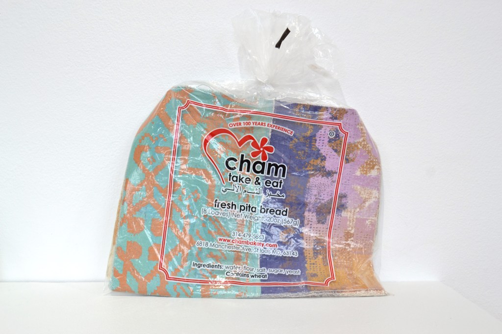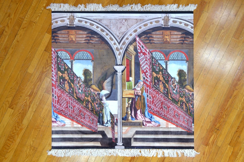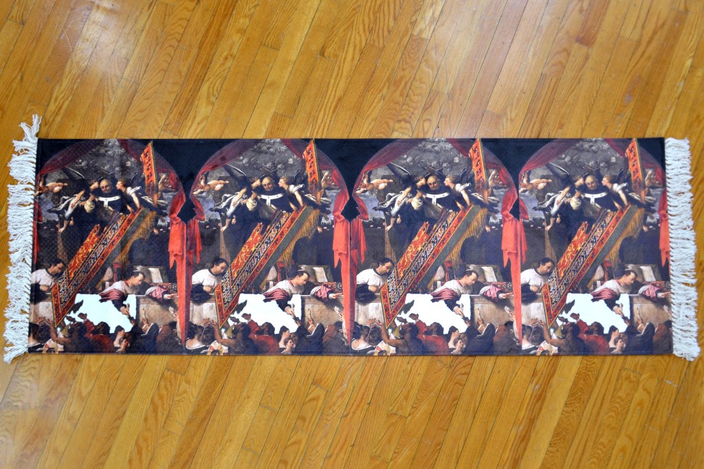 The display of the standing rugs are significant in being seen as physically present. Displayed in the manner of standing columns, the rugs give the impression of a rolled up rug with the patterns seen from the outside. The rolled up carpet patterns are to be seen as personified beings, transforming its original color and patterns and shifting to pastel colors and twisting and turning of the patterns in a literal uplift – a form of communicating their own narrative. For the digitally printed rugs depicting Renaissance works, the original scene is disrupted by a stretched out and expanded carpet in the work to emerge in the foreground, depicting the impression of its exit and leaving the Biblical scene of the image. Relating to removal and movement while introducing new forms of transformations, the rug patterns are torn into fragments and are transported inside individually labeled pita bread bags. This allows for both new and timeless existences to be practiced, preserved, and consumed.