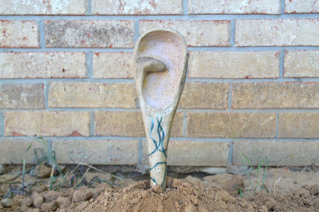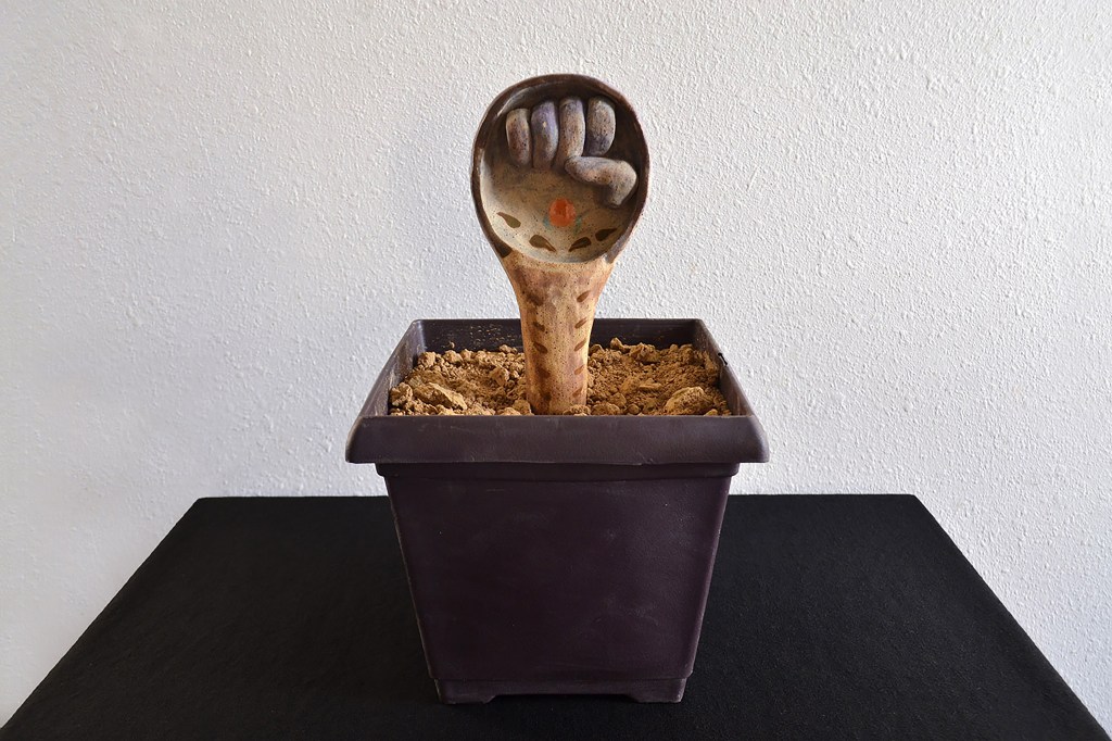 The resistance fist in the spoon symbolizes both joy and liberation from the cultural heritages I am a part of. They blend together the cultural practice of an Uzbek traditional dance that involves the use of decorative spoons as an instrumental tool and the recent event in 2021 of Palestinian prisoners who used spoons to escape out of their jail cells which became a newly celebrated resistance symbol. The spoons in this case are emerging out of the mosaics which take on a decorative representation of the ground below and its roots. The spoons expand its life form in existing as a vegetal presence and functional resistance symbol.
